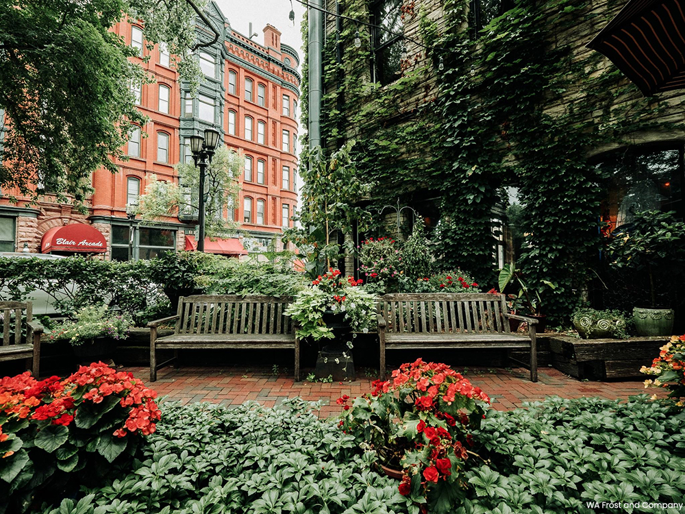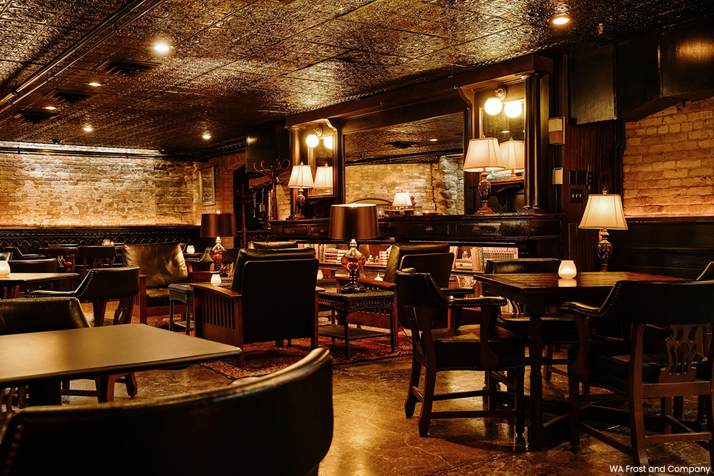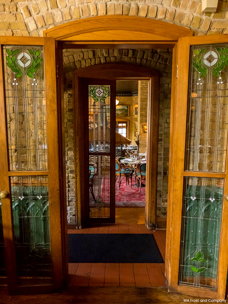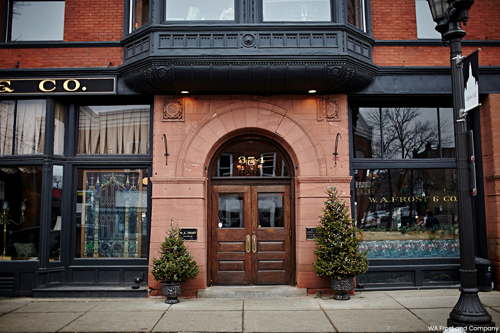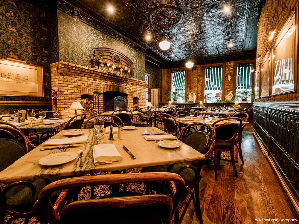 W.A. Frost & Company opened in the pharmacy space a year later. The restaurant kept as much of the building’s original charm as possible, and augmented it with period pieces and small modern upgrades. The original tin ceiling was restored, the exposed brick was cleaned, landscape oil paintings from the pharmacy were hung on the walls, and tables were placed near fireplaces to ramp up the cozy atmosphere. New oriental rugs were brought in and marble cut from an old bank building in Superior, Wisconsin, was used as table tops.