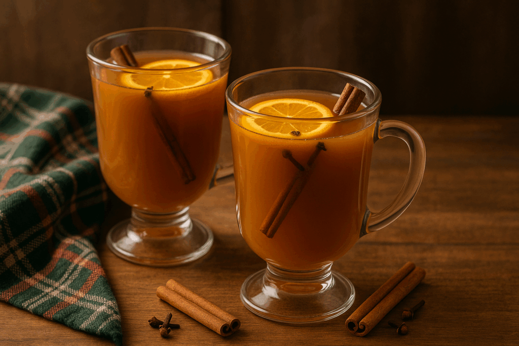 - Stir and serve in mugs. Garnish each mug with a lemon or orange half slice and a cinnamon stick.