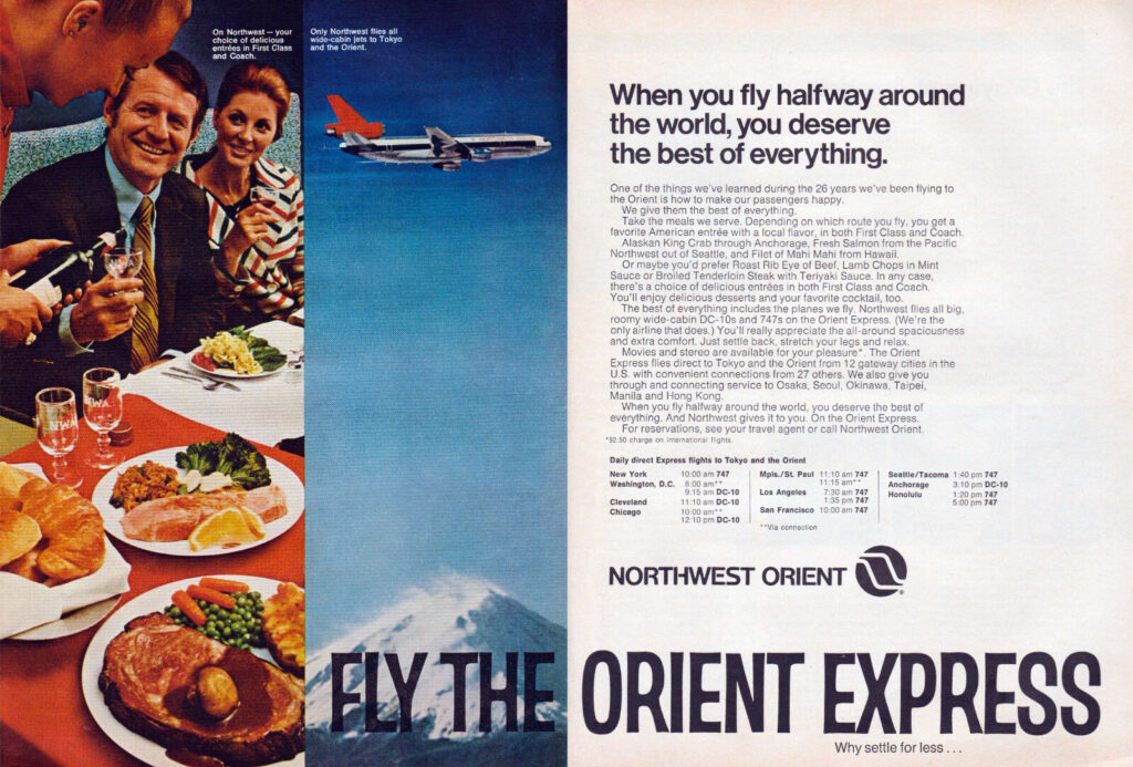 Although Northwest wasn’t the first airline to offer food and beverages to passengers on flights—American Airlines was the first to provide light refreshments like sandwiches, fruit, and drinks—it was noted for having some tasty meals available on some domestic and all international flights.